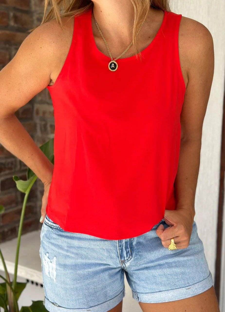 Blusa en Chalis color rojo. Manga sisa, escote redondo en frente y escote con gota de 18cm en espalda. Silueta semi ajustada