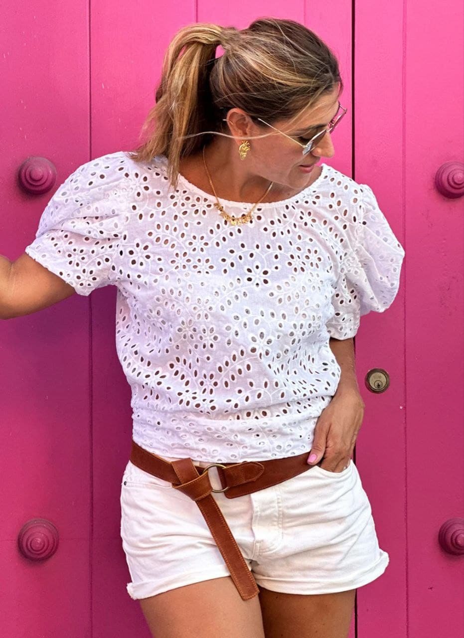Blusa en ojalillo color blanco, escote redondo en frente, manga corta con recogido en los hombros. la espalda tiene escote en V y botones además lleva fajón con tira libre para amarrar en la cintura. silueta semi ajustada