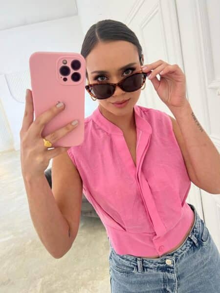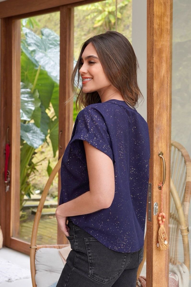 Blusa María en un color azul petróleo con detalles dorados La modelo mide 1,63 y usa talla S.